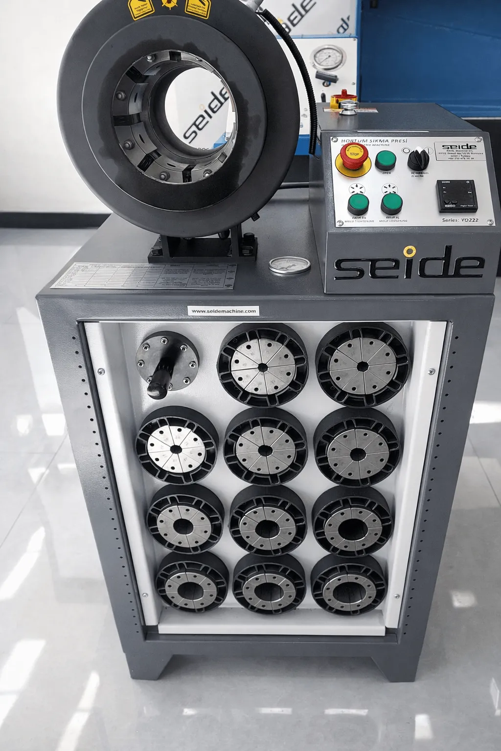 Endüstriyel hortum presleme işlemlerinde kullanılan bu makine, 3/16” ile 2” arası hidrolik hortum sıkma kapasitesi, güçlü hidrolik sistemi ve mikrometre ayar mekanizması sayesinde tekrar edilebilir ve güvenilir presleme performansı sunar.